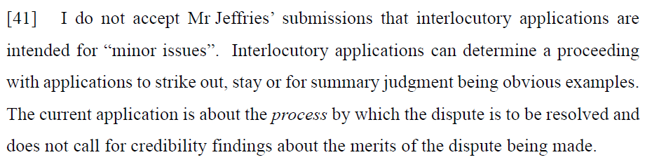 Associate Judge Lester was satisfied that the statement of claim (notwithstanding that the pleadings were somewhat undeveloped) were insufficient to concern the validity of an express trust. Associate Judge Lester was also satisfied that the proceedings could be determined by way of an interlocutory application. As noted at [41]: