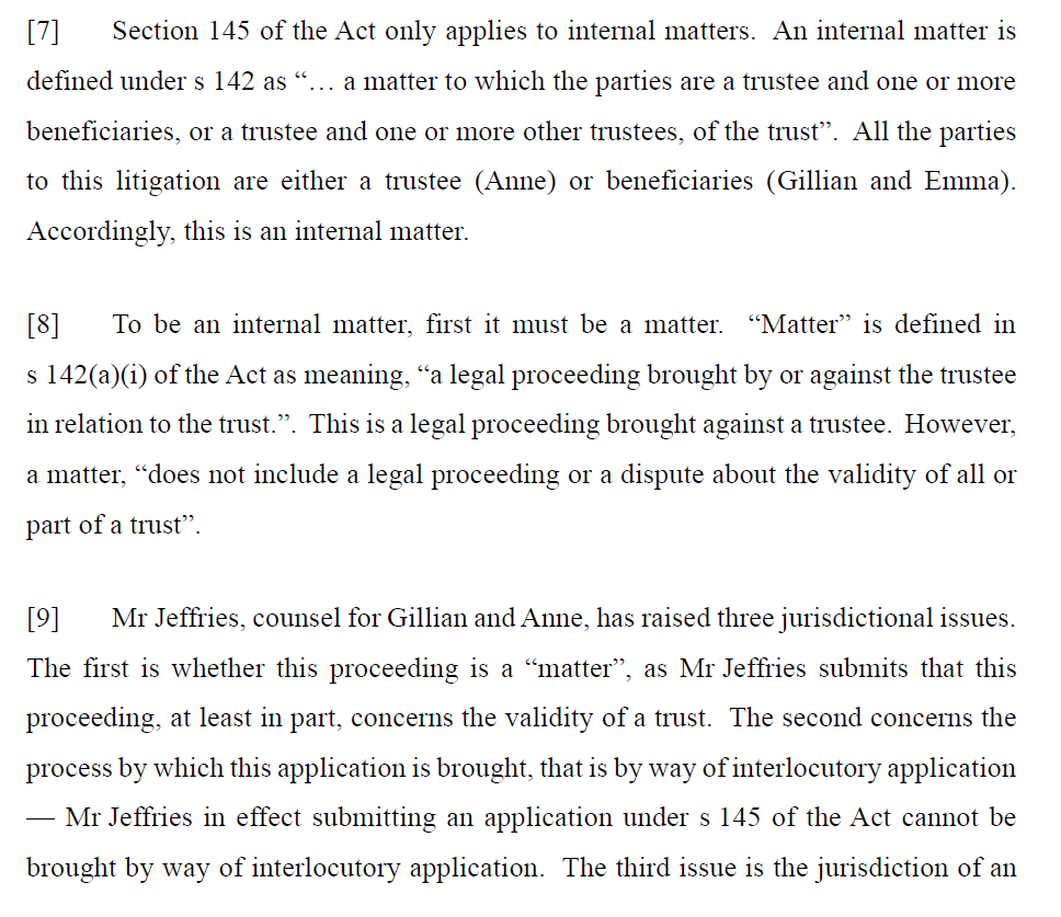 Associate Judge Lester was satisfied that the statement of claim (notwithstanding that the pleadings were somewhat undeveloped) were insufficient to concern the validity of an express trust. Associate Judge Lester was also satisfied that the proceedings could be determined by way of an interlocutory application. As noted at [41]: