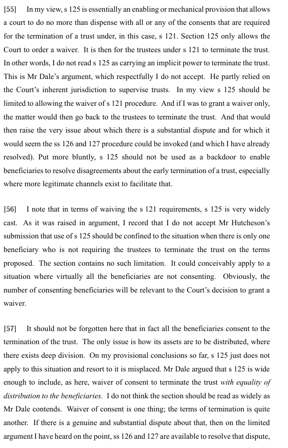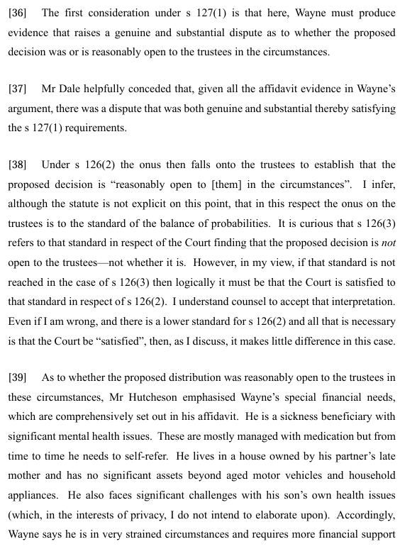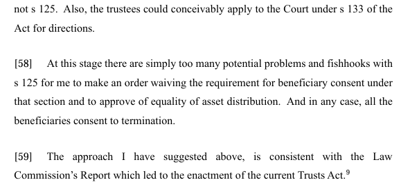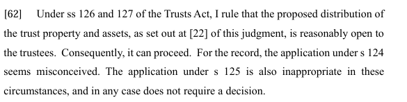 It was ultimately agreed that the application should progress as an application to review the trustees’ proposal for a final distribution of the Trust’s assets pursuant to section 126 of the Trusts Act (also copied below).