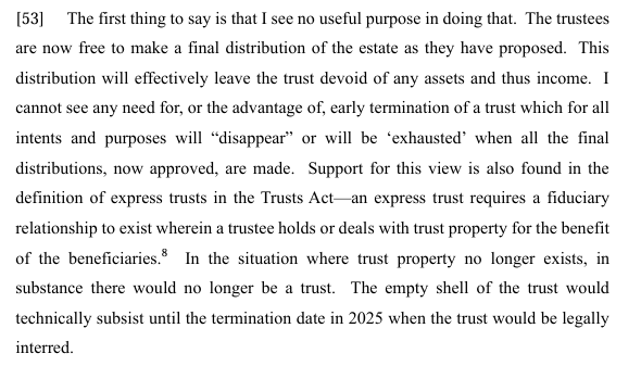 It was also put to the court that of the court upheld the trustees’ decision, the court could also approve the termination of the Trust.