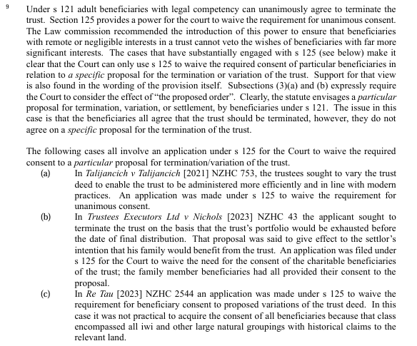 The matter came before the court pursuant to an application for orders terminating the Trust pursuant to section 124 of the Trusts Act (copied below). This was problematic as while section 124 of the Trusts Act “allows a court to act in a protective way on behalf of … the three types of beneficiaries described in s 124(2)(a)–(c) … counsel agreed that none of those three categories applied to any of the five siblings.”