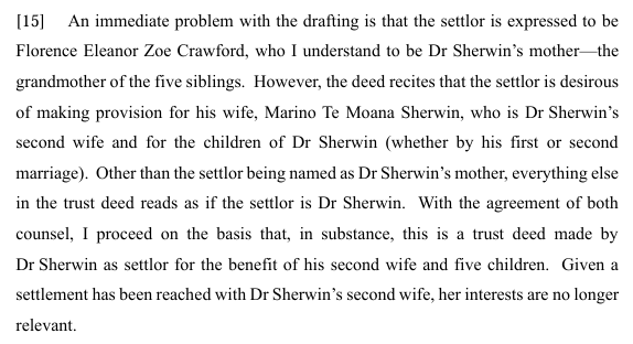 Sherwin v JKA Holdings Limited & Ors relates to the Douglas Hilton Family Trust (the Trust), which was settled in 1985 by Dr Douglas Sherwin’s mother on terms that infer that Dr Sherwin, who was the source of the trust’s economic wealth, was the true settlor. This is addressed by Becroft J at [15] as follows:
