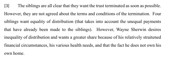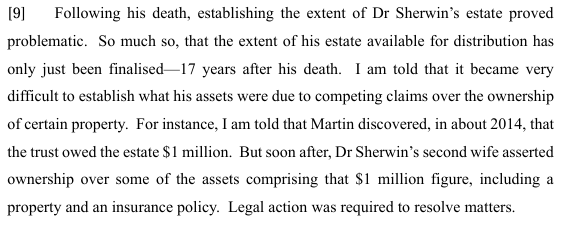 - it was well open to the trustees to differentiate between the terms of the will and “quite separate” trust. As noted at [48]: “I consider that it is quite reasonable for the trustees to administer the trust separately from the will. There is no necessity for the trustees to take into account Wayne’s actual entitlement under the will and no requirement for them to factor that into their distributions under the trust. Whatever Wayne might think as to his father’s intentions regarding all his assets, Dr Sherwin left no memorandum or parallel instructions regarding the trust. There was also absolutely no suggestion by Dr Sherwin that the trust should be distributed in the same way and on the same basis as the will, or that the trust should be applied in the “spirit” of the will.