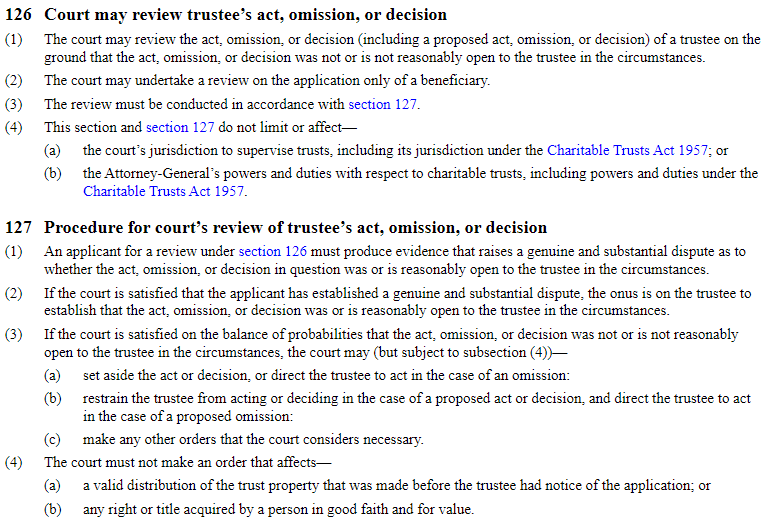 See Two step process to review trustee decision for further consideration of the interplay between sections 126 and 127 of the Trusts Act.
