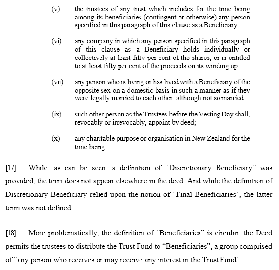As noted by Johnstone J at [7] ” … Certainty as to the objects of discretionary trusts, where the trustees are to have a discretion over the property the beneficiaries are to receive, requires that it be possible to state with “conceptual certainty” that an individual is or is not a beneficiary.”
