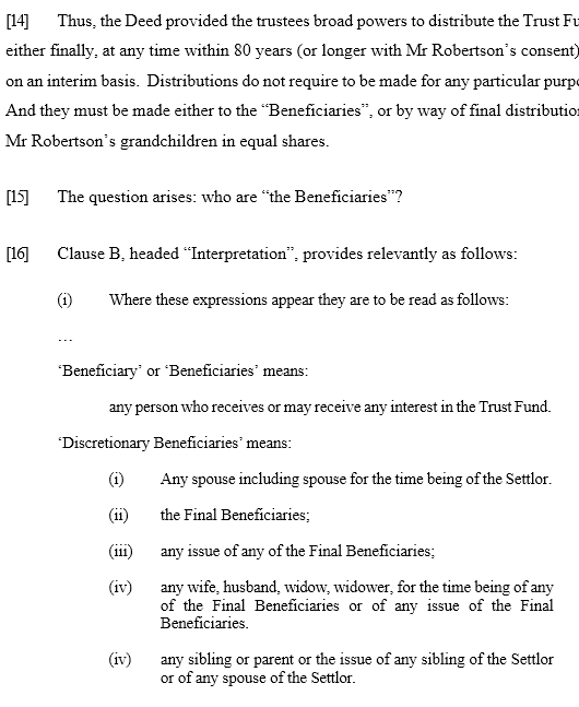 As noted by Johnstone J at [7] ” … Certainty as to the objects of discretionary trusts, where the trustees are to have a discretion over the property the beneficiaries are to receive, requires that it be possible to state with “conceptual certainty” that an individual is or is not a beneficiary.”
