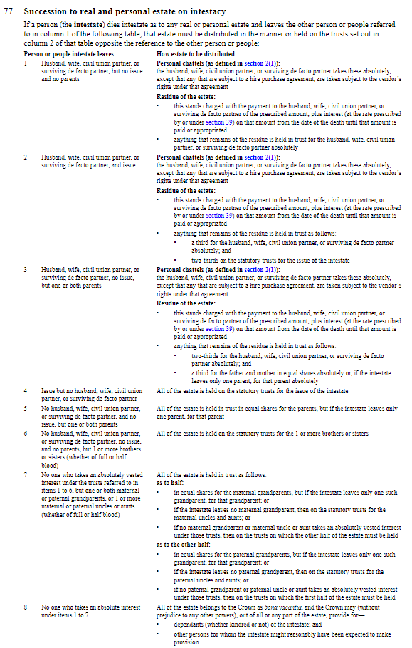 Accordingly, the deceased died intestate meaning that the provisions set out in section 77 of the Administration Act will determine the distribution of the deceased’s estate.