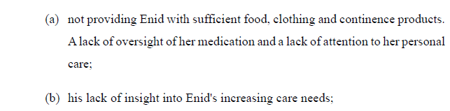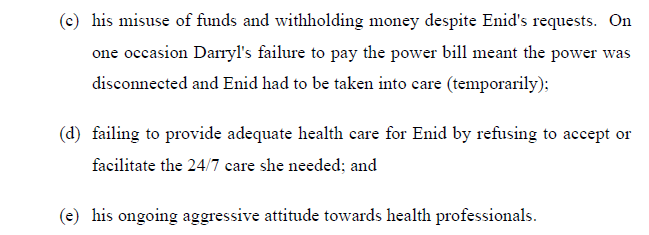 Evidence was given of Darryl obstructing contact between Enid and Karen. Documented concerns about Daryl’s care of his mother are set out at [64] as follows: