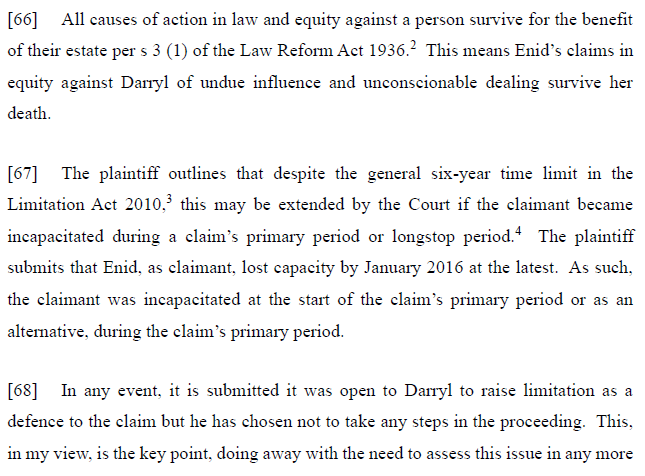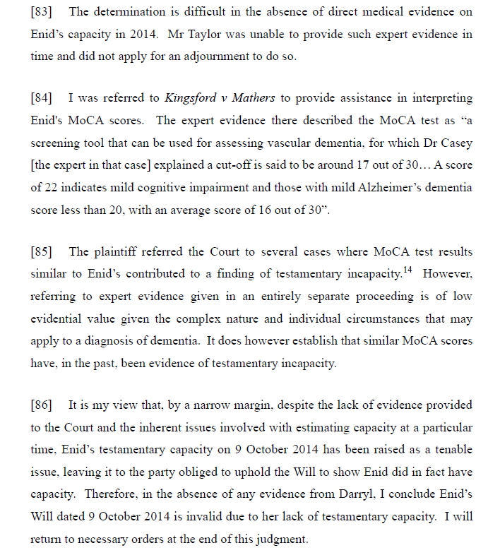 With respect to whether Enid’s will was invalid due to lack of capacity, after referencing the relevant authorities and evidence before the Court the conclusion reached in the information vacuum presented to the Court is set out at [83] to [86]: