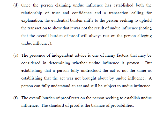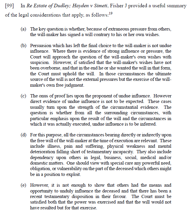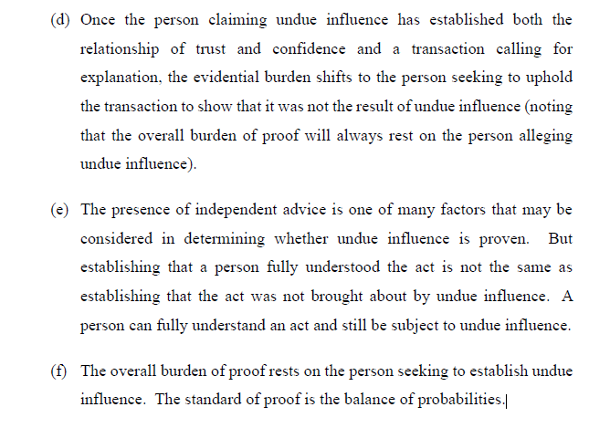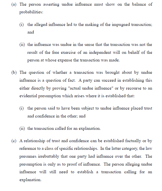 With respect to undue influence, it is helpful to set out the legal principles, which were summarised as follows at [87]: