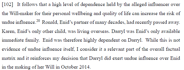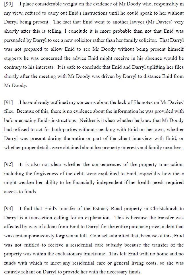 Importantly, the lawyer who acted on the transaction was not Enid’s family solicitor who declined to act on the matter as he was not able to meet with Enid without Darryl being present and who could not as noted at [36] “… provide her with independent advice [or]… have a proper discussion with her on her own.”