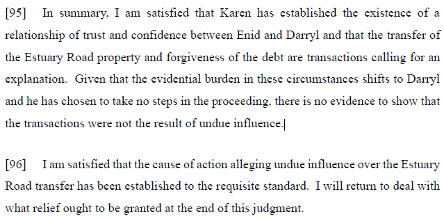“… it may exist in “the relationship between a son in the prime of life and parents in the evening of life”.The relationship between Enid and Darryl in October 2014 was clearly one of trust and confidence, especially considering Enid’s age and her emotional reliance upon Darryl. I am satisfied that a rebuttable presumption has been created, the effect of which is that I can find that Darryl had influence over Enid. That being the case, Karen must establish that the transactions complained about call for an explanation.”