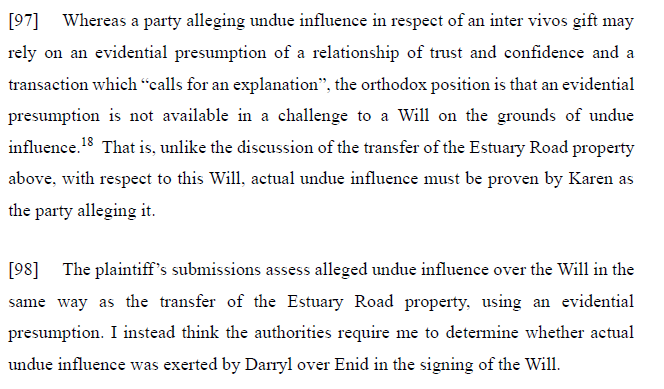 Although the transaction involving Enid’s home was found to be on account of undue influence, this does not automatically invalidate the will made at the same time. As set out at [97] to [ ]: