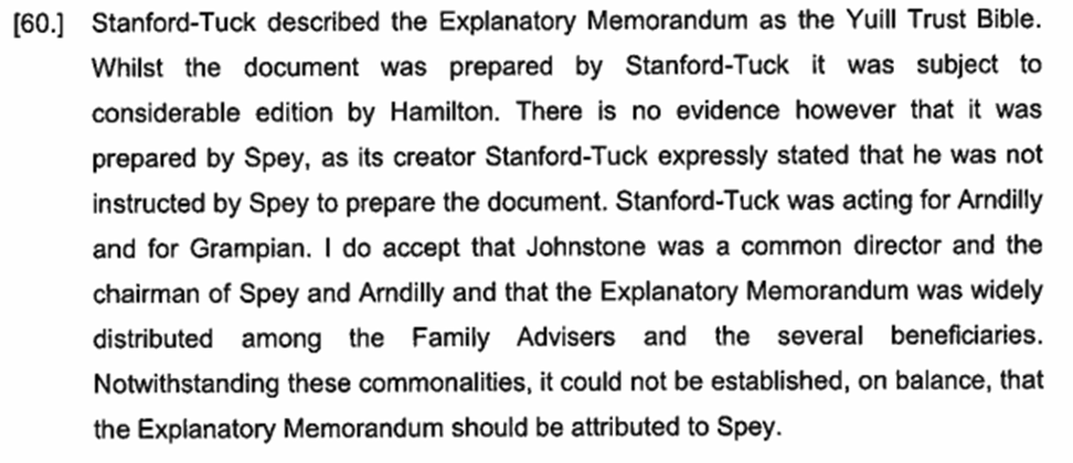 In 1992, Mr Johnstone received a copy of the 1992 Memorandum. There is no evidence that the other two directors of Spey at the time (Mr Lobosky and Mr Lowe) ever received, read, or knew about it. It is Grampian’s case that the 1992 Memorandum accurately set out what Spey’s wishes and intentions were, as settlor, when it transferred the assets to Grampian under the Glenfinnan Settlement. Mr Stanford-Tuck understood that the reference in the 1992 Memorandum as regards the Glenfinnan Settlement to the “next generation beneficiaries” was to those beneficiaries of the 1973 Settlement other than George, John and their wives. Mr Stanford-Tuck accepted in his evidence at trial that, when he prepared the 1992 Memorandum, he was not acting on behalf of Spey and it is now common ground between the parties that the 1992 Memorandum is not a document that can properly be attributed to Spey.