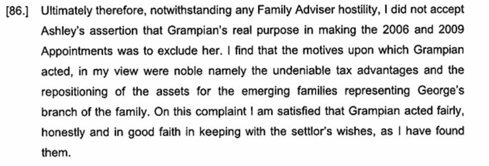 Grampian’s case has been that in making the appointments it was fulfilling the settlor’s wishes and that although Ashley had been a beneficiary of the Glenfinnan Settlement, that trust’s assets were to be accumulated for future generations.