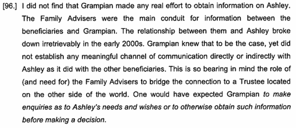 The main issues in the courts (the matter was heard in the Supreme Court (Bahamas), the Court of Appeal Bahamas and then on appeal to the Privy Council) have focused on the justification for the 2006 and 2009 appointments. Ashley’s case has been that Grampian had followed a policy of excluding her and her children as beneficiaries because the directors of Grampian and the Family Advisers were very hostile towards her. Ashley also argued that Grampian had failed to adequately consider her position and, in particular, that Grampian’s directors had failed to ensure that they had up-to-date information about her financial and other circumstances.
