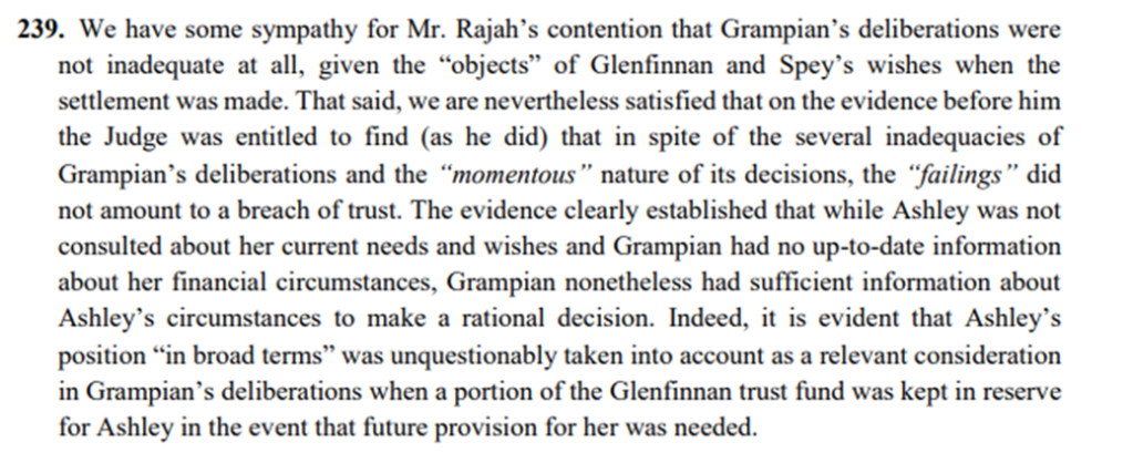 “… Once one accepts (as the Board has on Issue 1) that the wishes and intentions of Spey were that this trust was primarily for the benefit of the next generation, it is clear that Ashley cannot show that the decision would have been, or even might have been, different had there been no breach of fiduciary duty. Contrary to the advice of the Family Advisers, the trustee did provide for the needs of Ashley by holding back 2% (now worth some US$14 million) in the trust fund as a safety net for her. She was a very wealthy woman with funds from other sources, including the estate of her late husband John and, even though there was a breach of the fiduciary duty of proper consideration, Ashley cannot show that the trustee, or a reasonable trustee, would have acted, or even might have acted, any differently had there been no such breach.”
