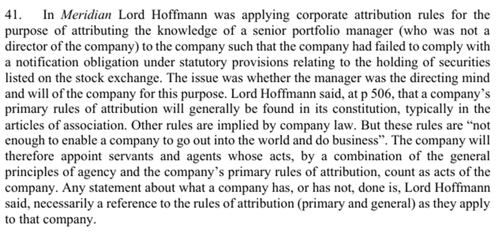 The Privy Council, which up-held the decisions of the lower courts, but with some clarification made the following observations regarding corporate attribution at [41]: