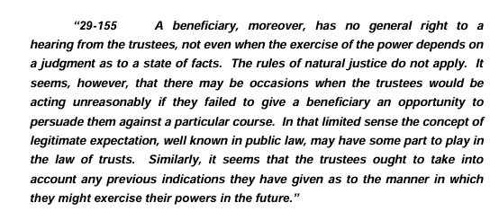 - The Court had to remind itself of its limited role and the legal principles that apply to discretionary trusts. The focus is not upon the expectation of the beneficiary but upon the information available to the person who the settlor has appointed as decision maker. There is no authority for the importation into trust law of a right to be heard or consulted. Such rights would potentially render trusts unworkable.