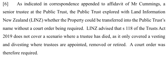 [11] I am therefore satisfied that, in accordance s 116(1), a new trustee of a trust has been appointed, and a trustee of the trust has been removed, through the death of the previous sole trustee, triggering the clause in the Trust Deed that appointed the Public Trust as the replacement trustee. Therefore, under s 116(2), the execution of the document of appointment, removal or discharge, namely the Trust Deed, has divested the trust property from Ms Arnott and vested the property in the Public Trust. Accordingly, under s 117(b) of the Trust Act, the Public Trust has a right, as the new trustees of the Trust, to call for the transfer of the trust property to itself.