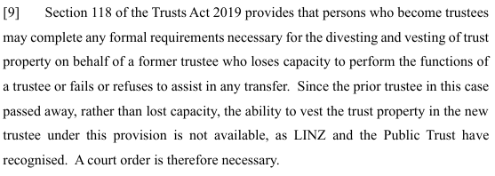 Section 118 of the Trusts Act 2019, which provides that persons who become trustees may complete any formal requirements necessary for the divesting and vesting of trust property on behalf of a former trustee who loses capacity to perform the functions of a trustee, fails or refuses to assist in any transfer. However, where a sole trustee dies section 118 is not available and a vesting order will be required.