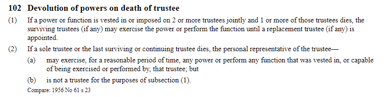 This is different to the position where a sole trustee dies and the death does not trigger the appointment of a new trustee. In this case section 102 of the Trusts Act 2019 may have application: