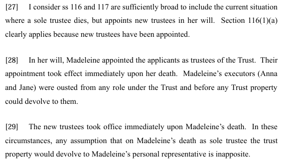 It may be that the court is making a distinction between an existing appointment being triggered (in which case s 102 is ousted and a vesting order is required), and an appointment being made following death (in which case s 102 is not ousted and the executor of the deceased sole trustee can accept the transmission and then transfer to a newly appointed trustee or trustees).