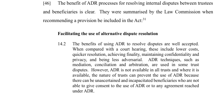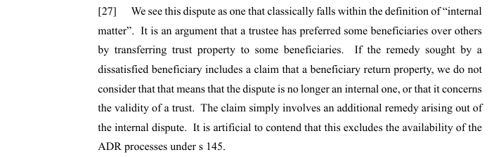 ADR can only be ordered in respect of internal matters that do not relate to the validity of all or part of a trust. In the appeal the appellants argued that the dispute concerned new arrangements in relation to the property in question that were additional to, and very different from the trusts established under Mr Gatfield’s will. In this regarding the Court of Appeal stated as follows at [27]: