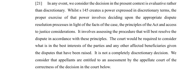 - whether a decision under section 145 of the Trusts Act involves the exercise of discretion or an evaluative assessment – this has procedural ramifications as if the assessment is evaluative, the appellant must identify an error that must be determined by the appellate court on the merits. Relevantly, as noted at [20] “A discretion will exist where there is more than one decision open to the decision-maker as a matter of law. That does not arise simply because the statute expresses the power in discretionary terms through the use of words such as “may.”…” On this point the Court of Appeal states at [21] that: