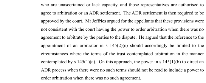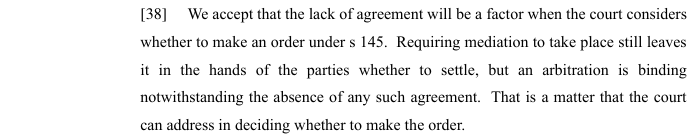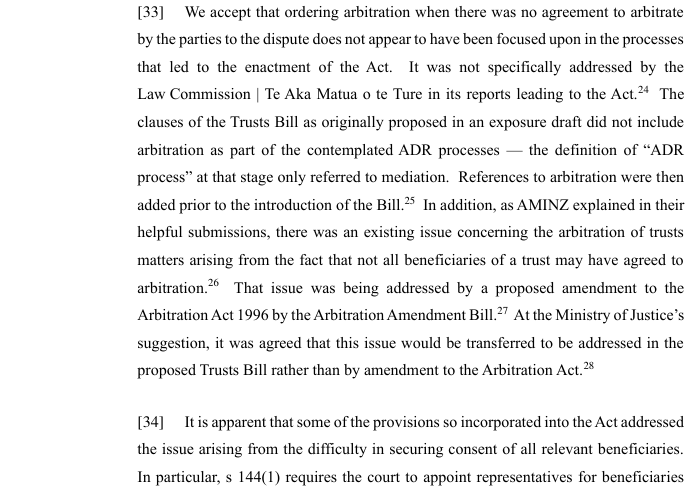 The appeal also traversed whether an order can be made pursuant to section 145 of the Trusts Act in the absence of an agreement to arbitrate. This is traversed at [33] to [34] in the following terms: